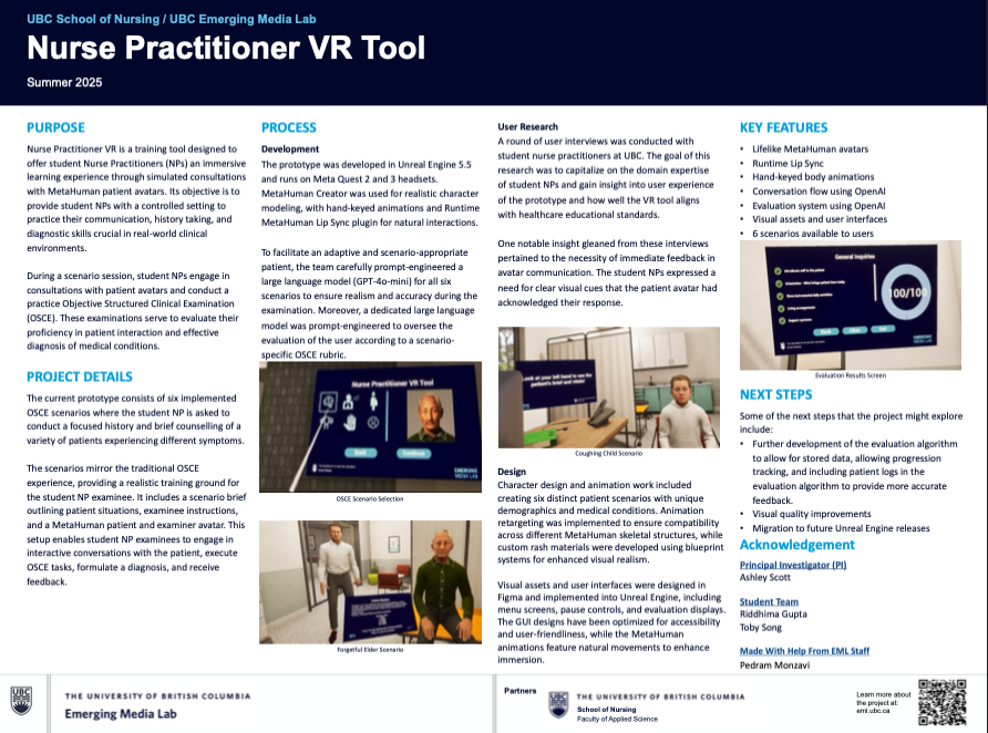 The avatars will exhibit and describe real signs and symptoms, allowing students to practice their clinical skills in various simulated patient care situations. The latest iteration of this project expanded the number of practice scenarios, implemented a detailed feedback system for users, and improved meta-human interactions. Ultimately, it is hoped that integrating VR technology into pedagogical practices used in nursing programs will aid students’ transition from fragmented textual knowledge to competency-oriented application.